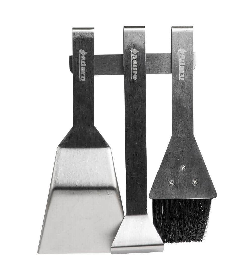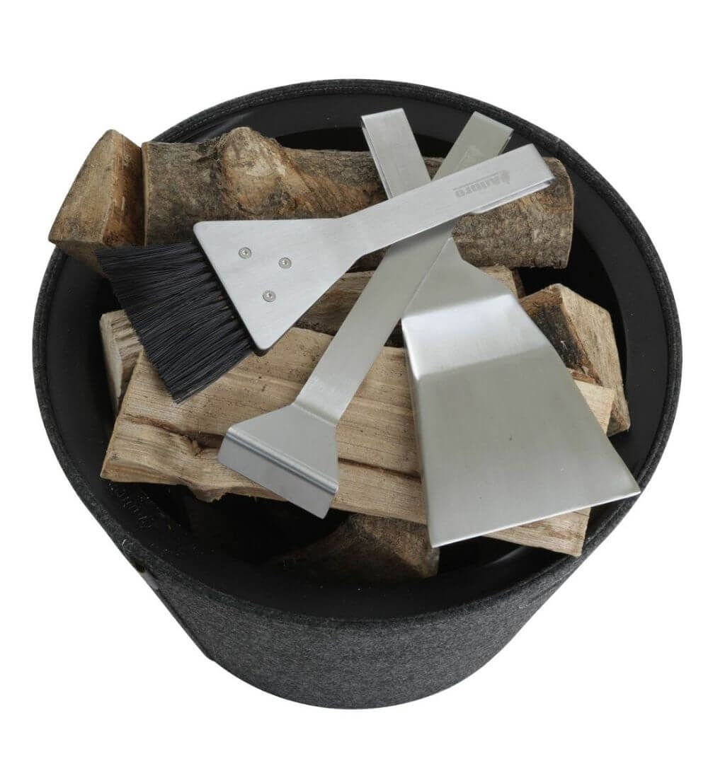 - Die Utensilien sind mit einem Magnet ausgestattet, wodurch sich weitere Aufhängungsmöglichkeiten für das Set – beispielsweise an der Rückseite des Ofens oder an der Innerseite der Schublade des Kaminofens - ergeben.