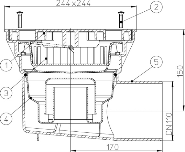 Perfektablauf DN110 waagrecht mit Wassergeruchsverschluss, 244x244mm / Gussrost 226x226mm HL605W